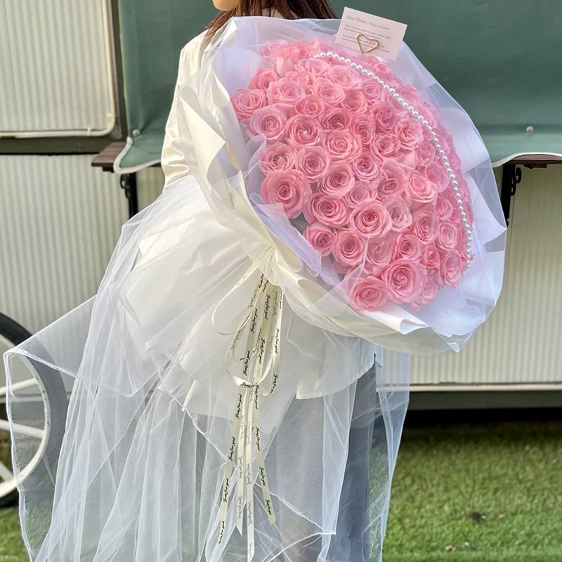 花 材:99朵精品粉玫瑰,1条珠串装饰花面。