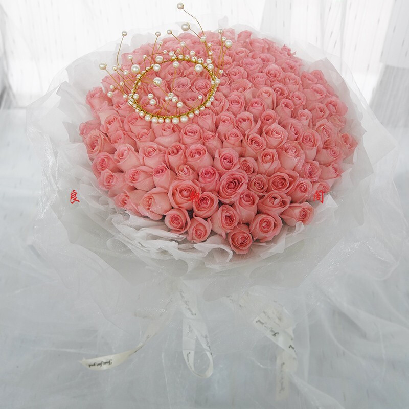 花材: 精选120朵粉玫瑰,搭配皇冠装饰 。