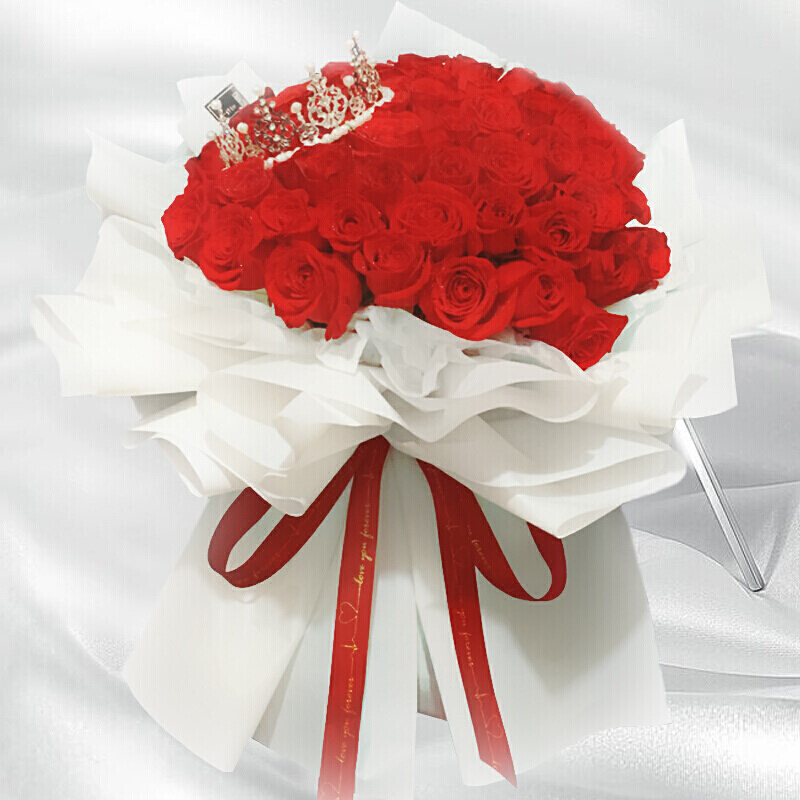 花材: 52朵红玫瑰,皇冠装饰花面。
