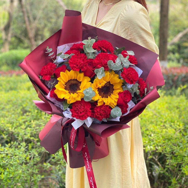 花 材:12朵红色康乃馨,5朵红玫瑰,2支向日葵,搭配尤加利装饰。
