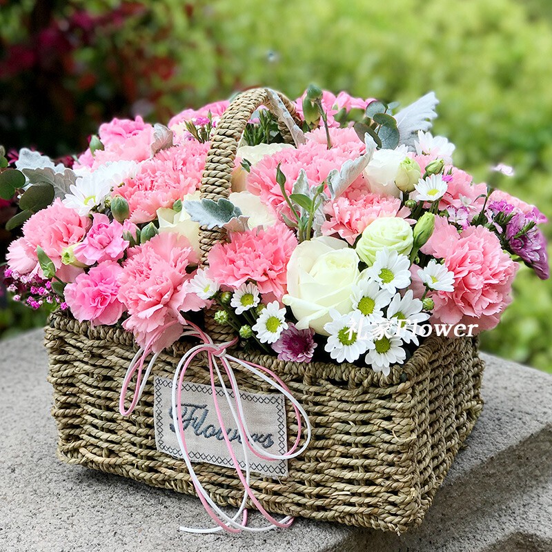 花 材: 16朵粉色康乃馨,5朵白玫瑰,搭配桔梗,多头粉康,小雏菊,相思梅,银叶菊装饰,粉色蝴蝶结点缀。