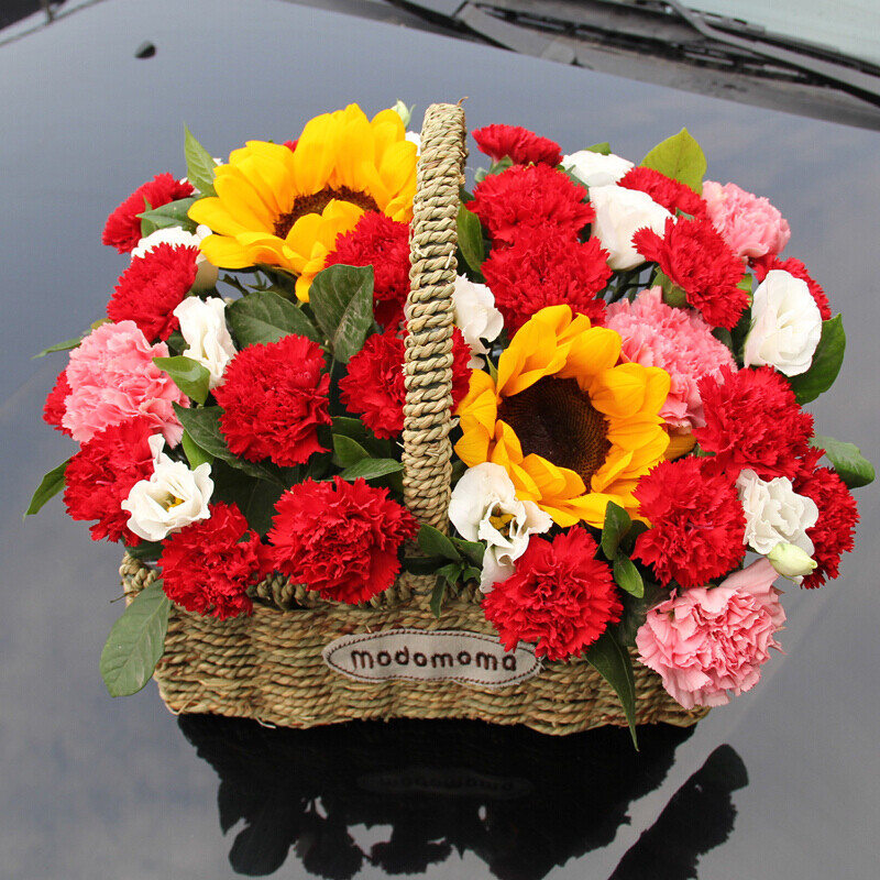 花 材:精选2朵向日葵,20朵红色康乃馨,5朵粉色康乃馨,9支白色洋桔梗(断货则用9朵白玫瑰代替),栀子叶装饰。