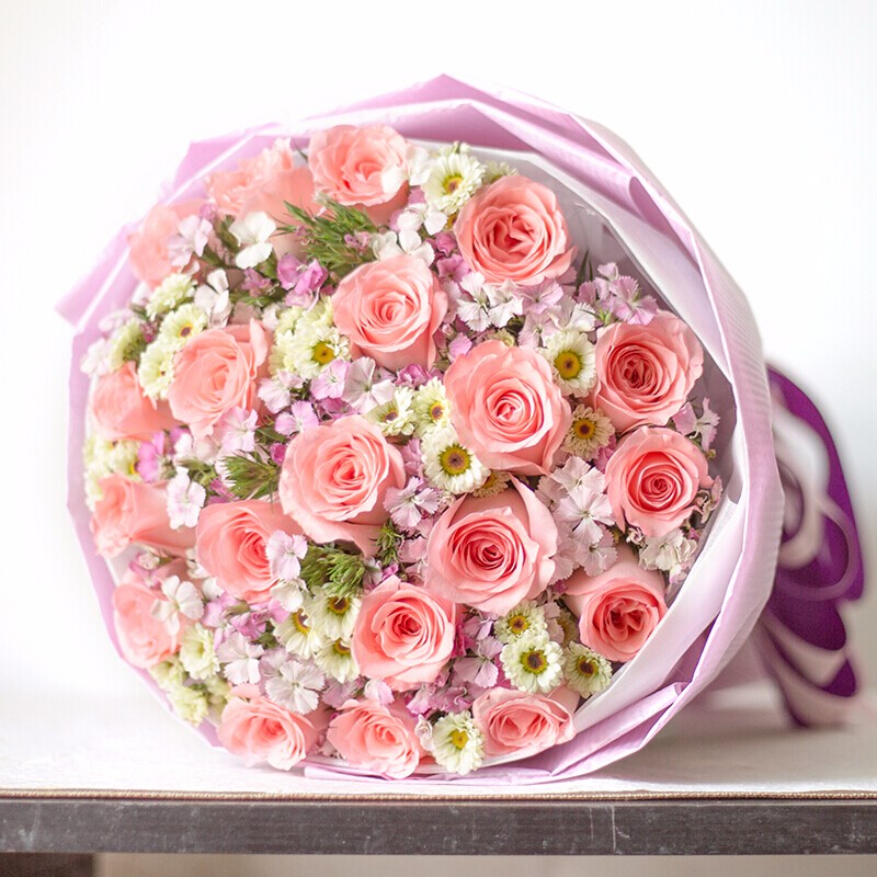 花材: 33朵精品粉玫瑰,搭配进口小雏菊、石竹梅搭配。