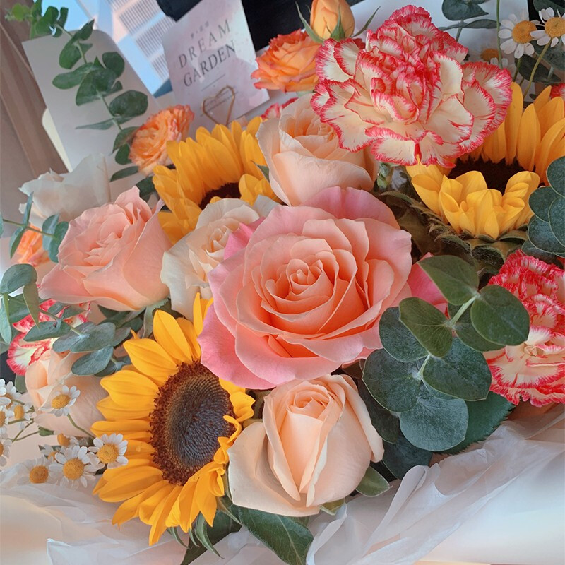 花 材:3支向日葵,8朵粉色系玫瑰混搭,3支粉色多头康乃馨,2支橙色多头小玫瑰,搭配洋甘菊,尤加利叶装饰。