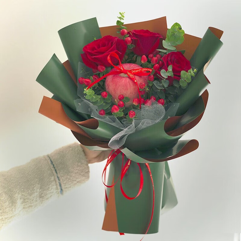 花材: 3朵红玫瑰,1颗苹果,搭配尤加利叶、红豆装饰。