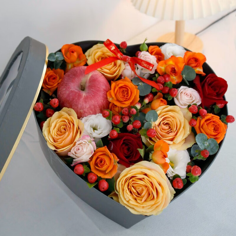 花材: 1颗苹果,5朵香槟玫瑰,2朵红玫瑰,6支多头小玫瑰(断货则用6支金辉玫瑰代替),5支洋桔梗,搭配红豆,尤加利叶。