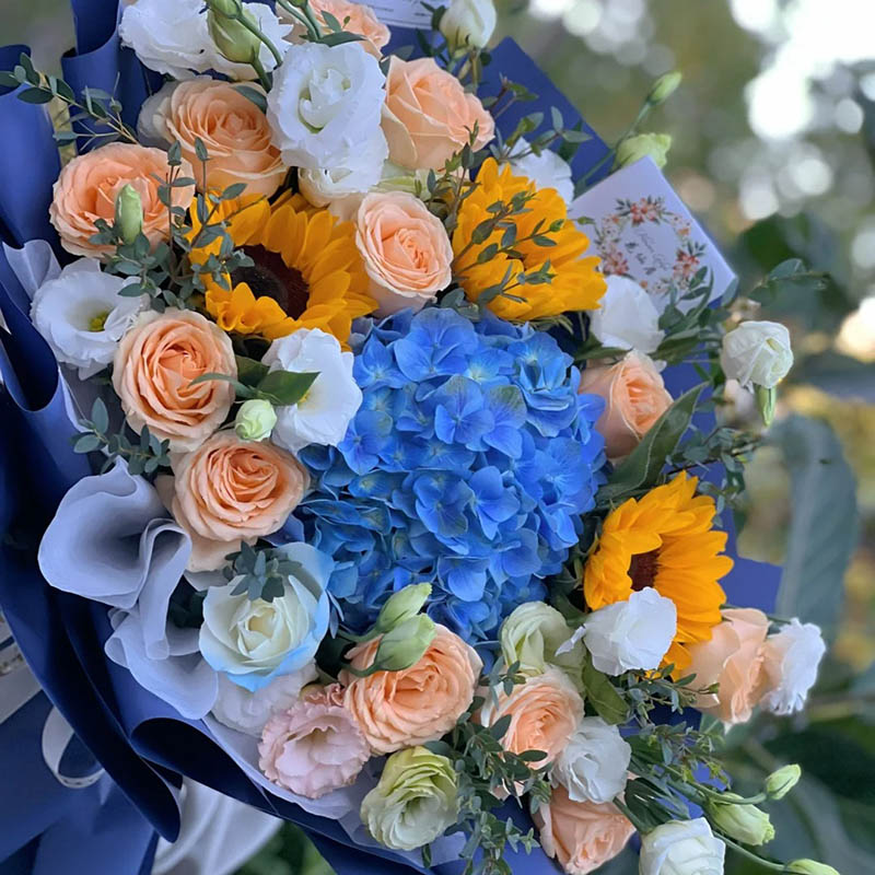 花 材: 1支蓝色绣球,3支向日葵,11朵香槟色玫瑰,搭配8支洋桔梗(断货则用8支白玫瑰或者橙色多头小玫瑰代替),尤加利叶间插装饰。