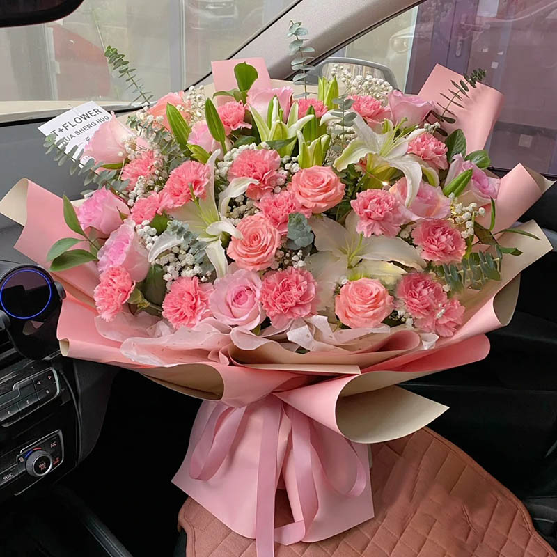 花 材:28朵粉色康乃馨、粉玫瑰混搭,4支多头白色香水百合,搭配尤加利叶、满天星装饰。