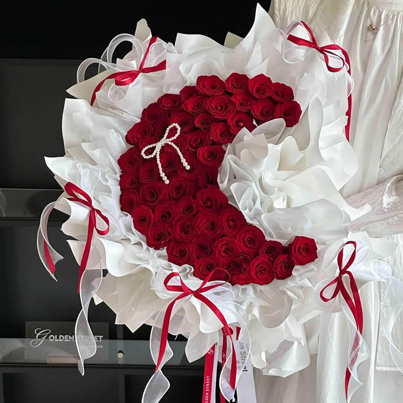 花材: 39朵红玫瑰月亮造型(可根据花朵开放程度增加红玫瑰保证造型,不低于39朵),1条珍珠蝴蝶结装饰花面。