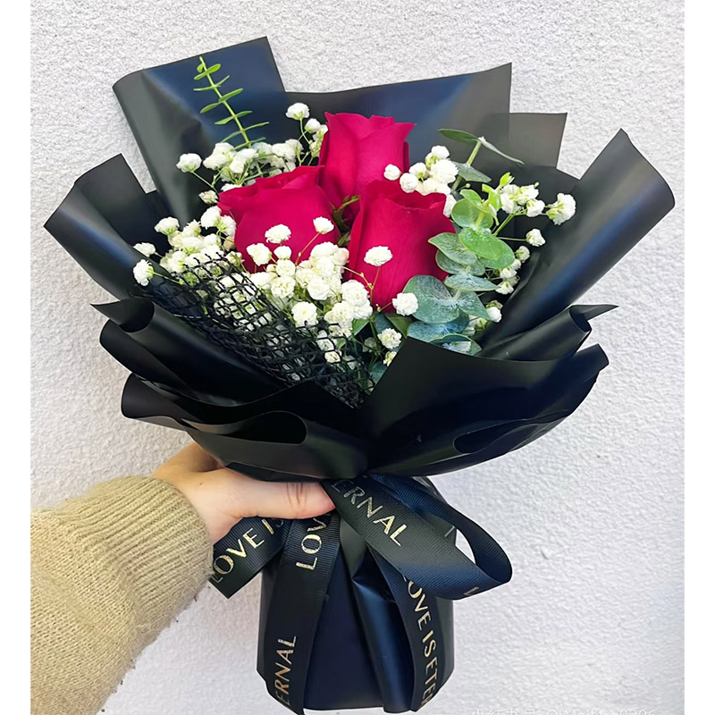 花 材:精选3朵红玫瑰,搭配满天星、尤加利叶装饰。