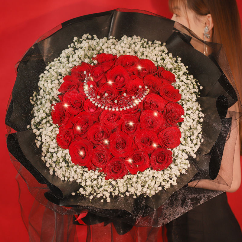 花材: 33枝红玫瑰搭配白色满天星环绕、1个皇冠(款式随机)、1条串灯。