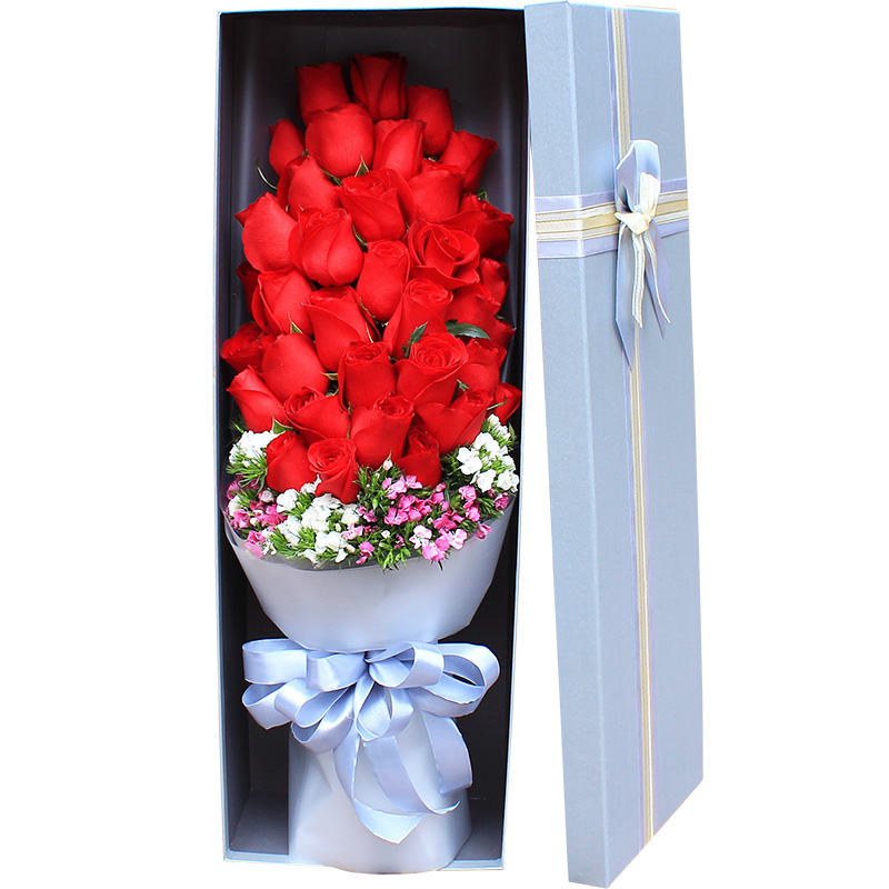 花 材:33枝红玫瑰,搭配石竹梅装饰。