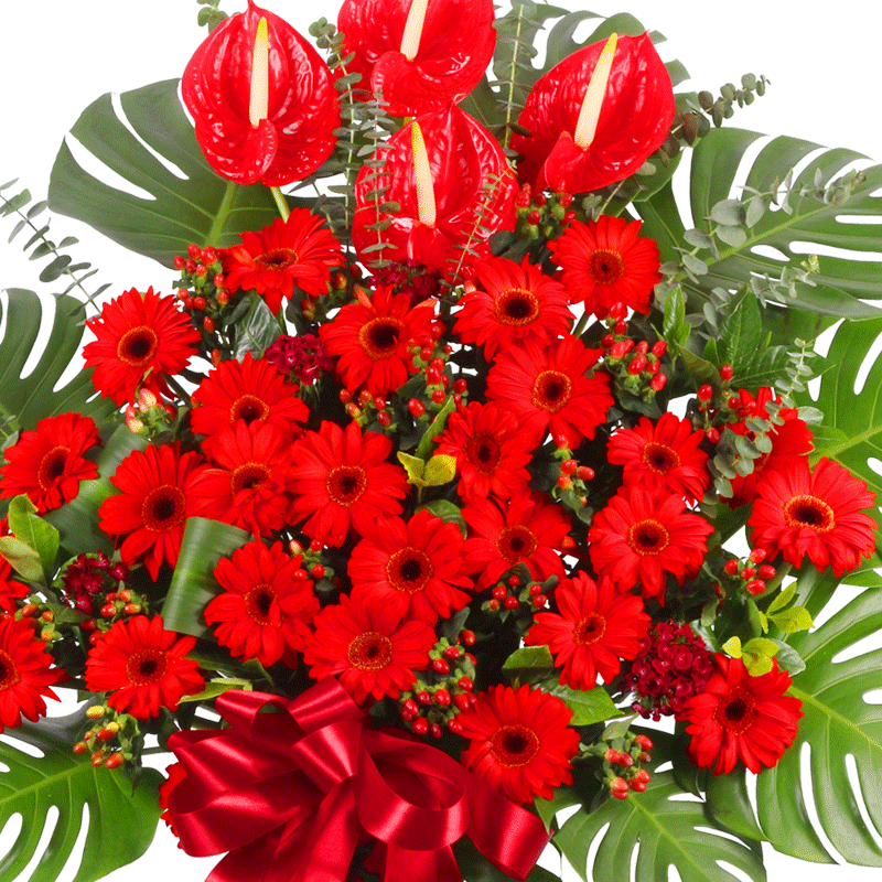 - 财旺运旺 - 红色扶郎花25朵,红掌4朵,搭配适量红豆、红相思梅、尤加利叶、栀子叶、龟背叶。