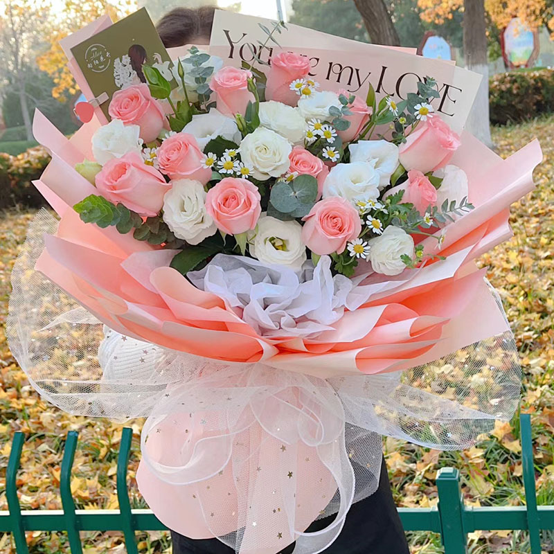 • 花材精选11朵粉玫瑰、8支洋桔梗(断货则用8支白玫瑰代替),尤加利叶、洋甘菊装饰。