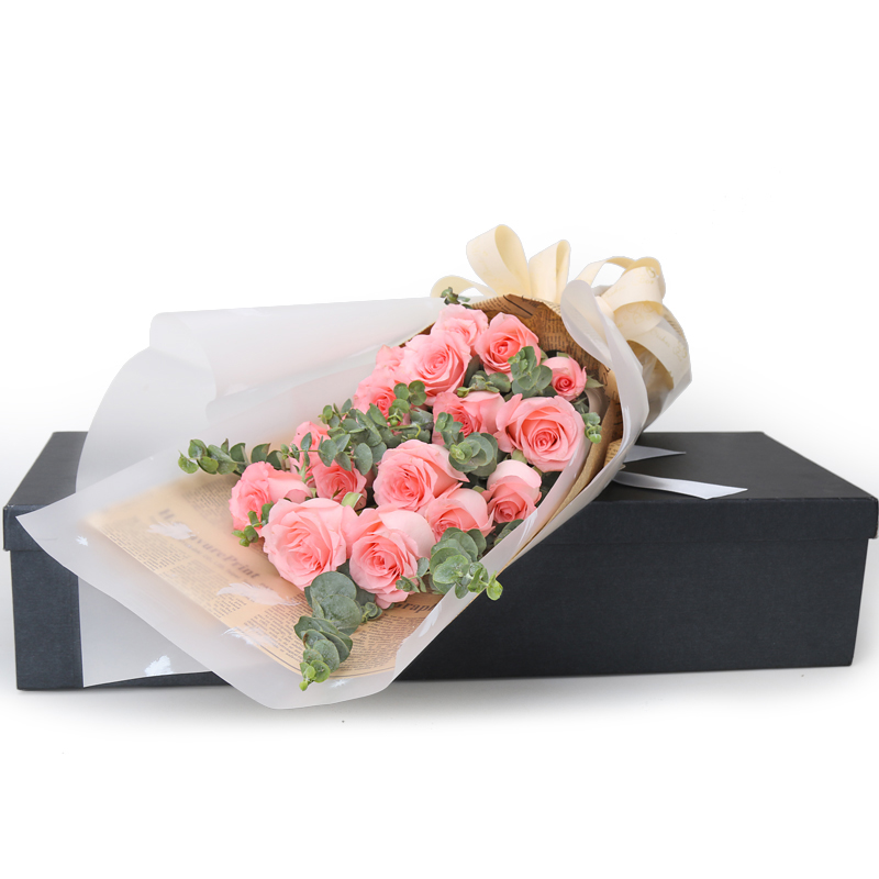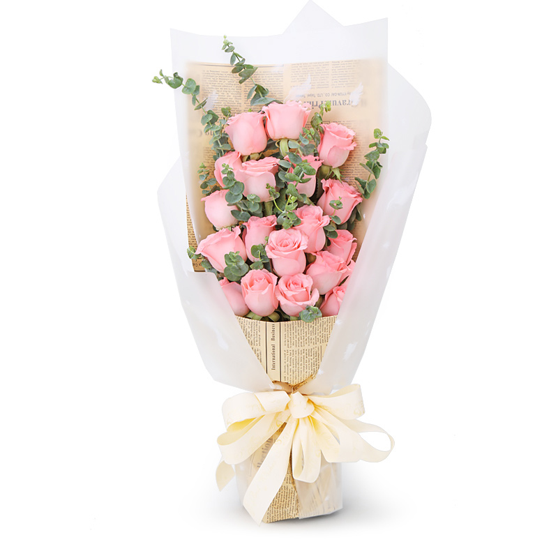 - 花材19支精品粉玫瑰,搭配适量尤加利