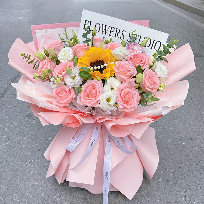 • 花材12朵粉玫瑰,1朵向日葵,1条珠串,6支白色洋桔梗(断货则用6支白玫瑰代替),搭配尤加利叶装饰。