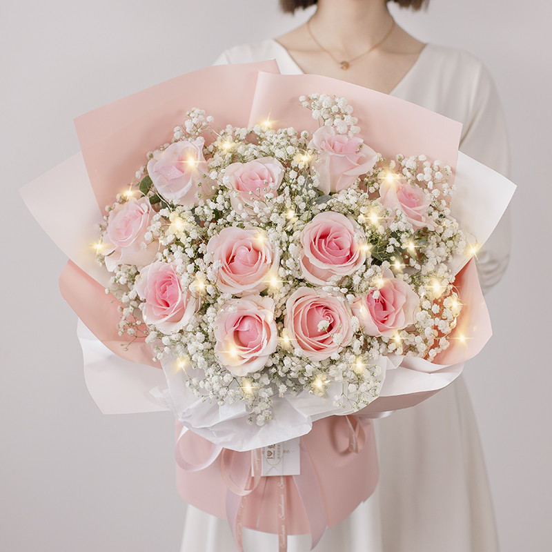 - 念星也念你 - 11朵粉玫瑰,1条灯串,搭配满天星装饰。