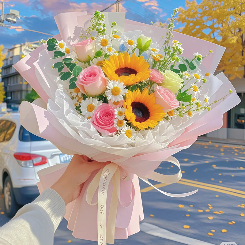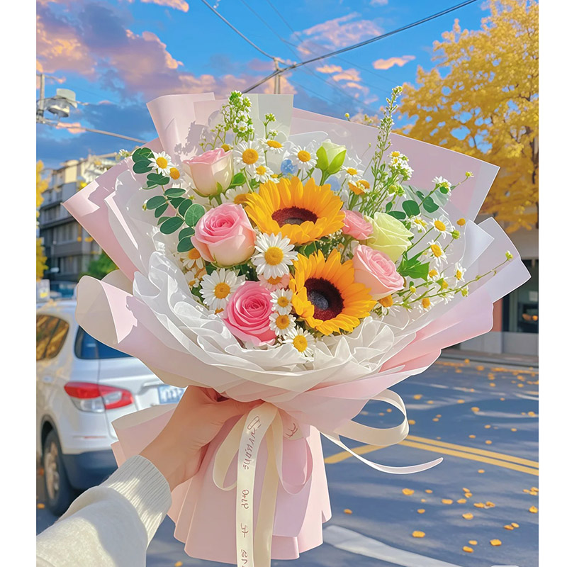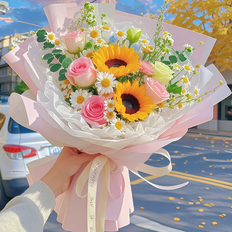 - 光芒万丈 - 精选2支向日葵,5支戴安娜粉玫瑰,1支洋桔梗,搭配洋甘菊、尤加利叶装饰。