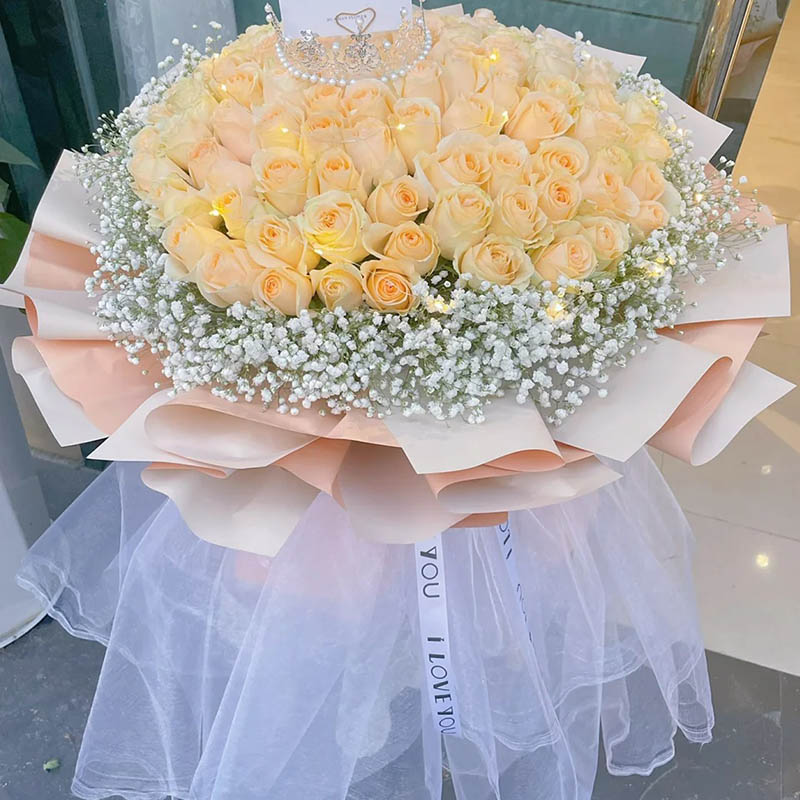 • 花材精选99朵香槟玫瑰花,1顶皇冠皇冠,满天星环绕装饰。