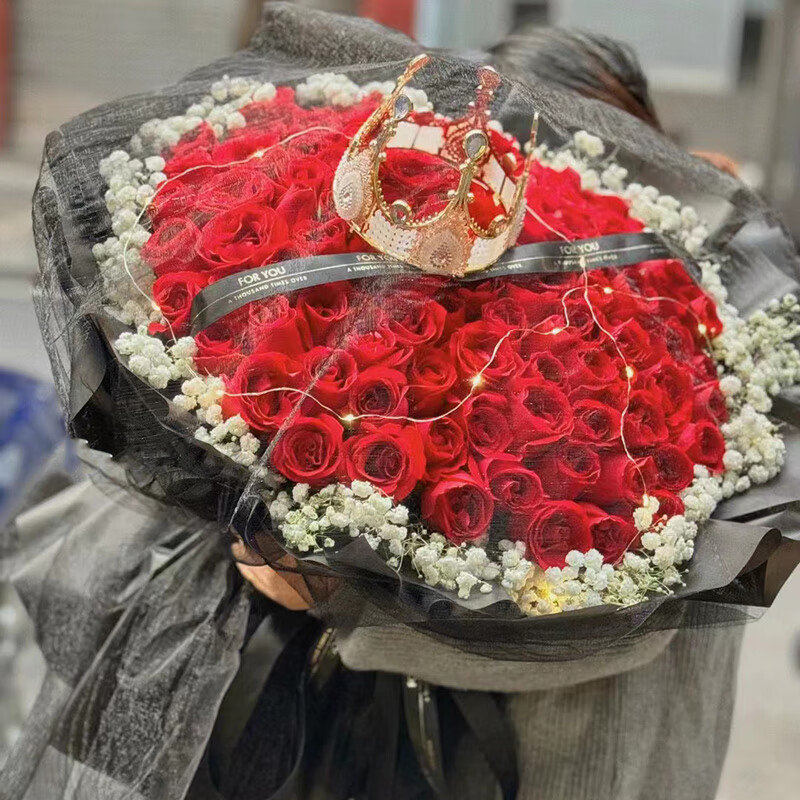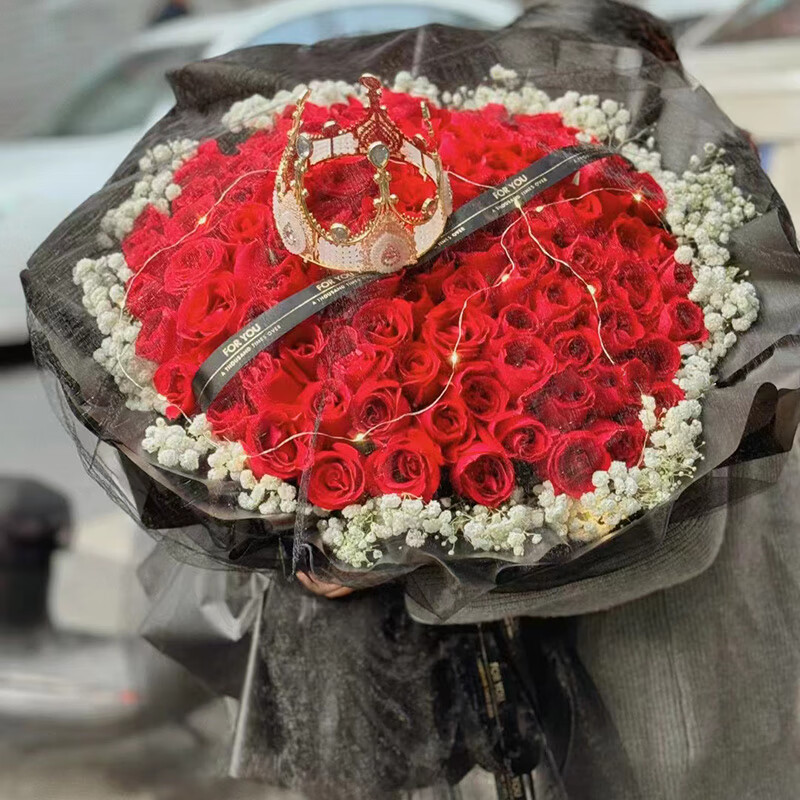 • 花材99朵精品红玫瑰,1条灯带,1顶皇冠(款式随机),黑色缎带装饰花面,白色满天星环绕。